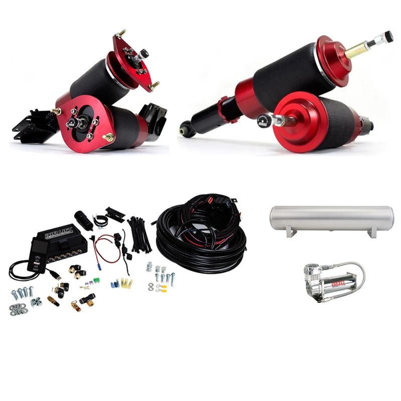 Simple, economical air suspension. Offers practical ride height and jaw dropping lows. Front kits generally offer fixed rate dampers without height or camber adjustment, and rear kits are generally supplied without dampers to keep the costs down.